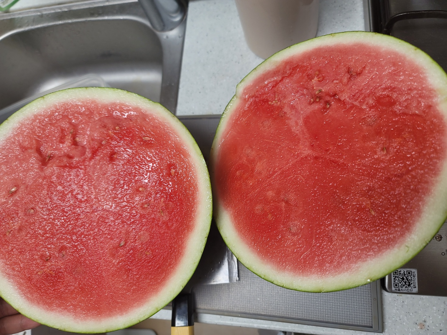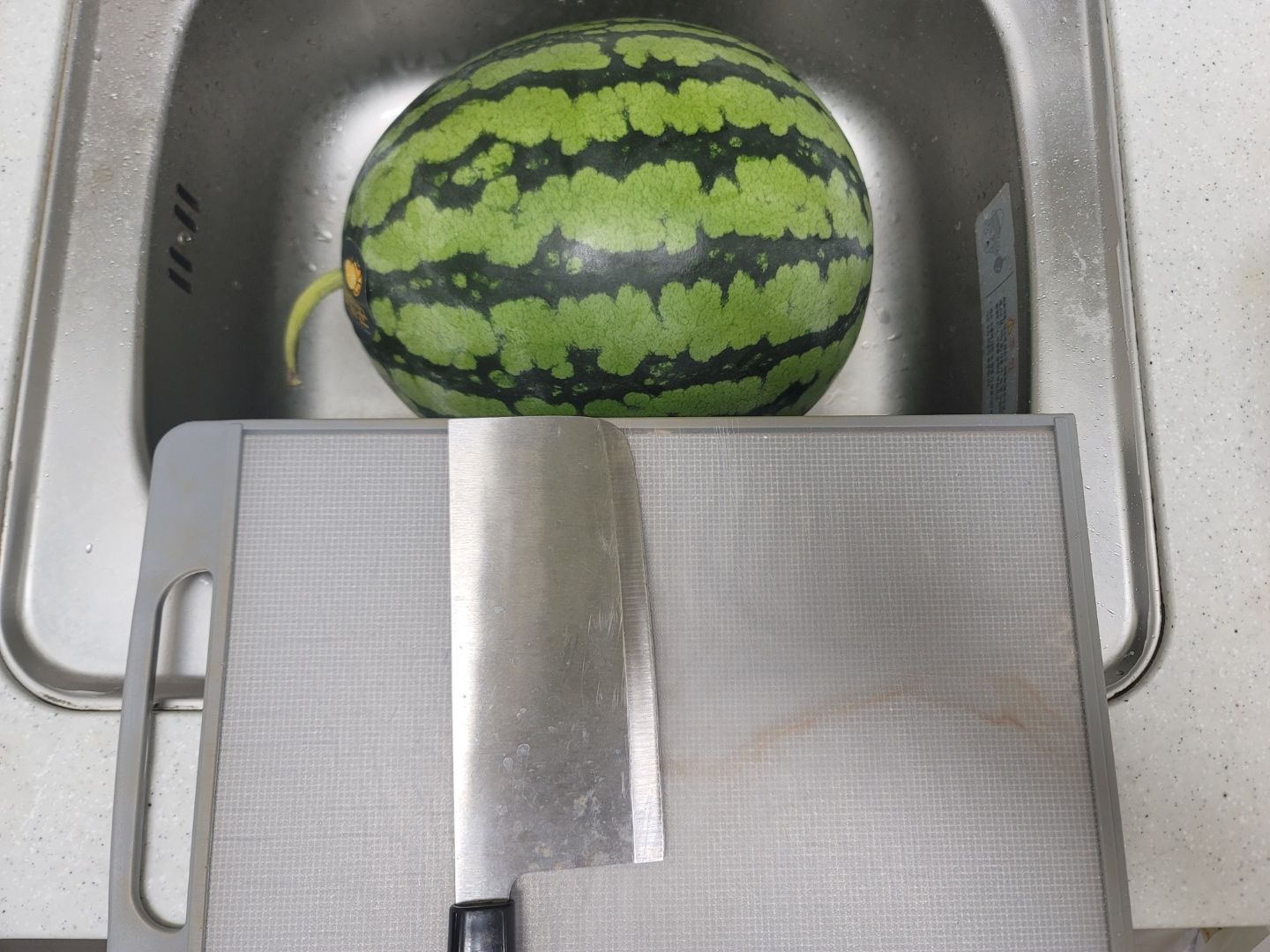 작은 도마와 베트남에서 사온 중식도로 수박을 쪼갠 모습