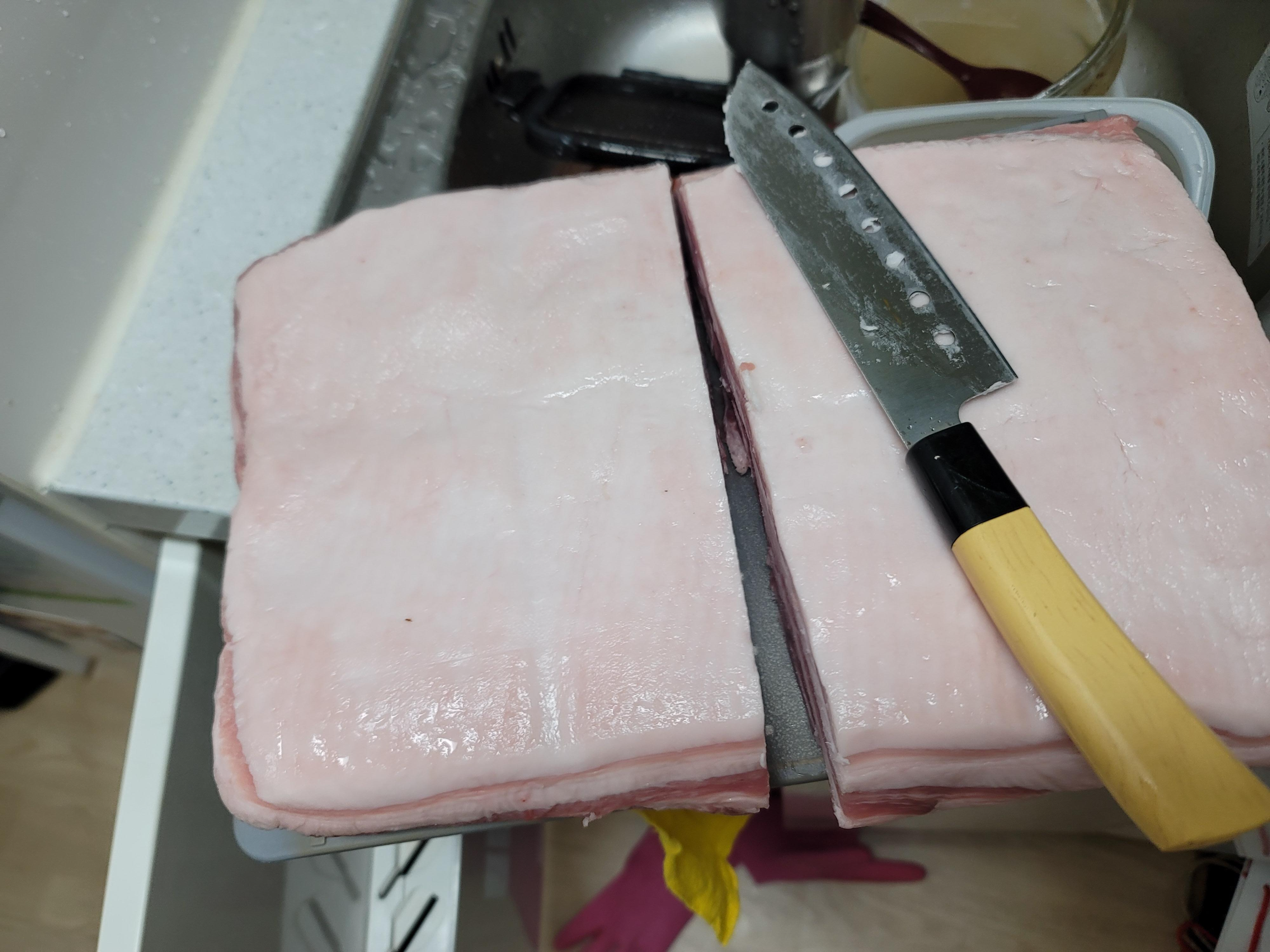 이것이 무엇인가? 정육점에서 보기만하던 삼겹살 통? 덩어리이다.