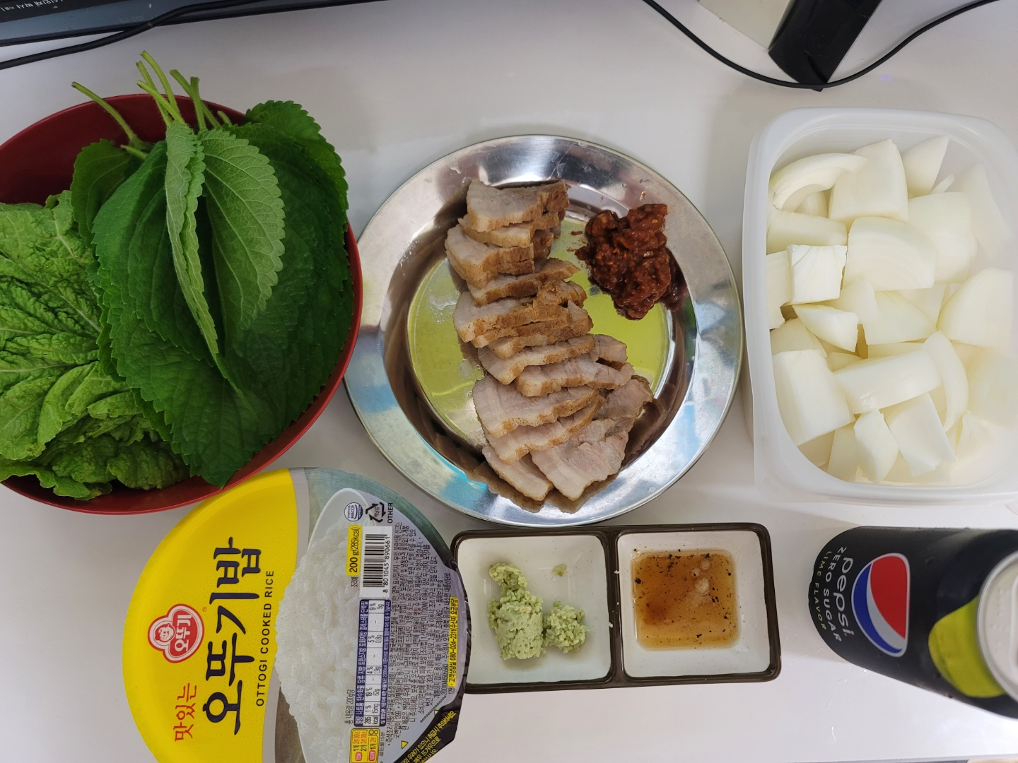 준비한 깻잎, 배추쌈, 양파를 배치했습니다.